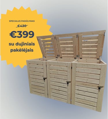 Atliekų konteinerių stoginės-dėžės ir kiti baldai sodo tvarkai